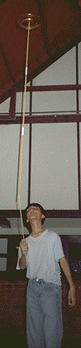 First hold your plate vertically with your subordinate hand, with the rims facing the dominant hand. Take a stick with your dominant hand and point it to the top of the rim, now let go of your plate and let it hangs on the stick.