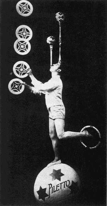 Picture Paul Conchas balancing an artillery piece on his head. Picture Paul Spadoni seated, juggling a tray, table, cup and saucer. Picture a close-up of Rastelli's powerful hands gripping a ball and a club. Picture Paolo Piletto standing on one foot on a rolling globe, spinning a hoop on the other foot, balancing two balls on pedestals and juggling five hoops.