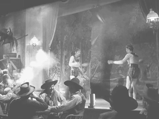 At 49:17, they are seen doing their club passing routine on the saloon stage, when Lon Chaney Jr., as bad guy Jack McCall, uses his handgun to shoot the clubs as they fly between the jugglers, until Robert Stack, as Marshall Jim Holliday, stops him.