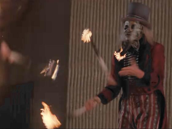 At 13:50, 3 men on stilts with 3 torches each appear on and off for 36 seconds, but only one juggles the torches, while the others just wave them around. But at the end of this scene, 2 of the stilt walkers can briefly be seen passing 6 torches.