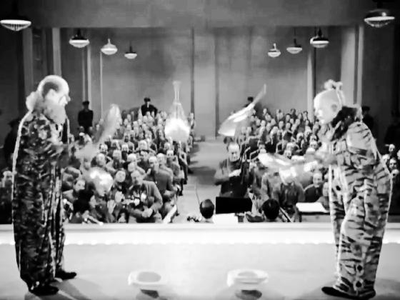 At 52:50, they do their show dressed as clowns, seen for 46 seconds. As the curtain opens there is a long shot of them passing 7 clubs. Changing to a closer shot, one club has evaporated, and now they are passing 6 clubs low and fast. They then switch to doing 5 hats, using several different patterns. They take their final bows, and leave.