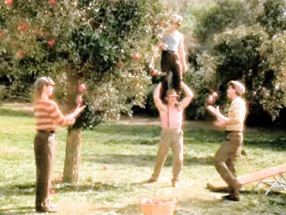 At 0:32:12, two brothers pick apples and then juggle 3 apples each and then toss some to Pee-wee.