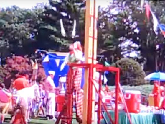 At 28:28, during a garden party, a stilt walking clown, played by Jonathan Seglins, juggles 3 clubs briefly before being tripped and falling.