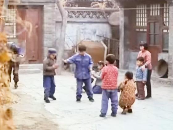 At 10:42, a Chinese boy plays with a simple wooden one-piece whistling diabolo for 30 seconds while several other children watch excitedly.