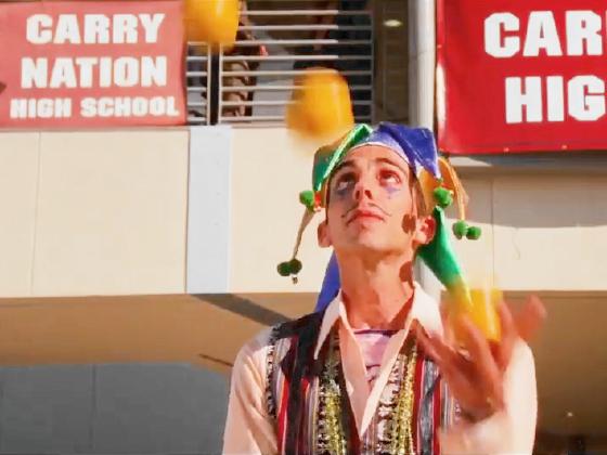 At 0:26:03, Scot Nery plays a juggling boy, and juggles 5 balls for 12 seconds as he prepares to enter the high school talent show.