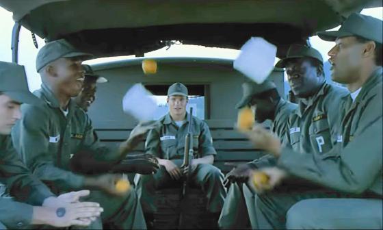 At 0:59:38, in the back of an army truck, 2 men each juggle 3 oranges for 4 seconds.