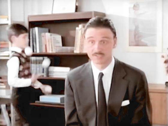 At 18:55, 10-year-old Mark Bakalor appears in a 2 minute scene at the child psychiatrist's office, providing comic distraction as the psychiatrist speaks with the hero. Mark is dumped out of a chair, then balances an umbrella, juggles 3 balls, and does a Groucho Marx impersonation. After the door is closed, you hear the sound of a slap come from inside, followed by Mark yelling, "Oww!"