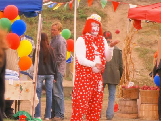 At 47:28, during a local outdoor fair, a clown juggles 3 balls for 6 seconds.