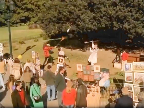At 11:01, Martín Dahab juggles 3 clubs with very high triple spins, while another performer blows fire, and a third twirls a staff.