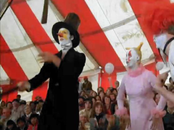 At 1:06:12, a circus performer is seen juggling 3 varied large knives for 2 seconds.