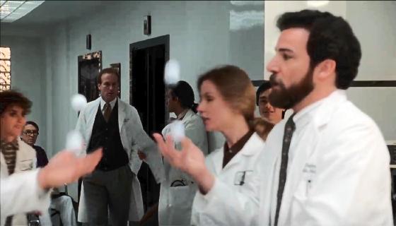 At 1:02:08, Mandy Patinkin and Kyle Secor juggle 3 golf balls each at a nurses' station.