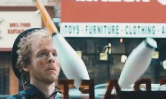 At 41:56, Mia gazes out the window and sees a street performer, played by Kevin Percival, juggling 3 clubs, seen for 13 seconds.