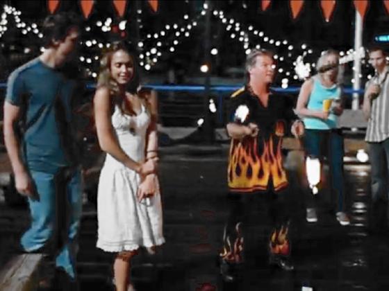 At 44:03, Mike Battie juggles 3 torches at night at an amusement park for 23 seconds, first in the background, and then in the foreground.