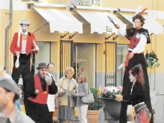 2 are on stilts, one juggling 3 clubs and the other swinging 2 clubs,