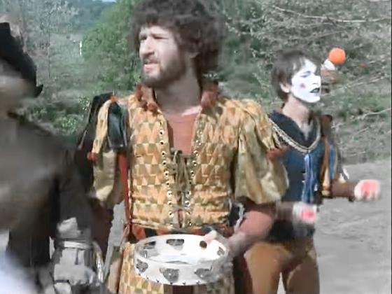 At 0:02:46, during the opening credits, a jester walks across juggling 3 balls for 2 seconds at an outdoor festival.