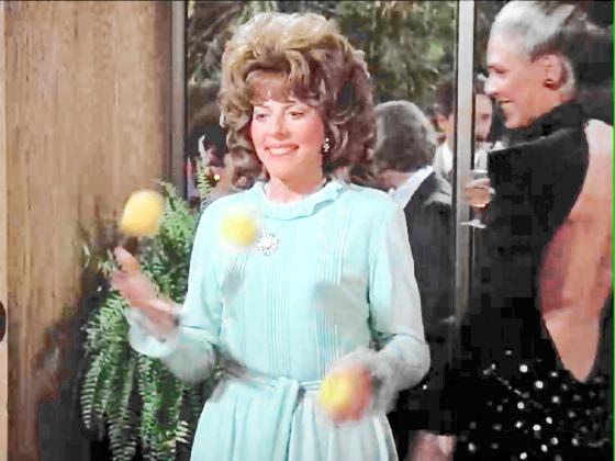 At 1:26:55, Betty Gorham juggles 3 yellow apples at a party, seen for 4 seconds.
