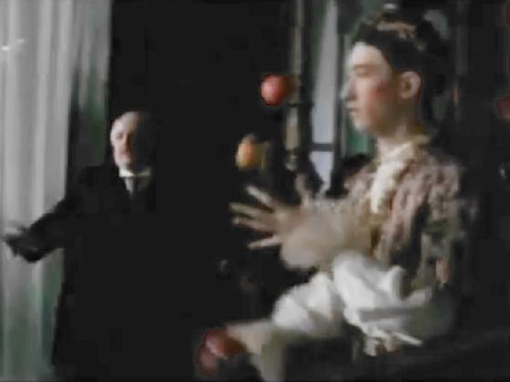 At 1:14:28, Thomas Vindevogel juggles 3 balls back stage as he prepares to perform at a theater, seen 3 times over 13 seconds.