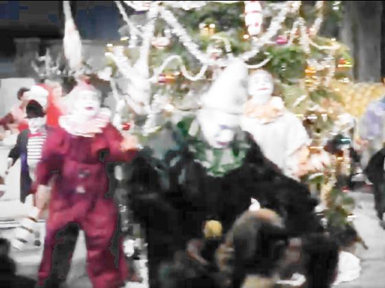 At 1:31:56, and for the next 70 seconds, 2 clowns are seen 4 times juggling 3 clubs each for a total of 20 seconds.
