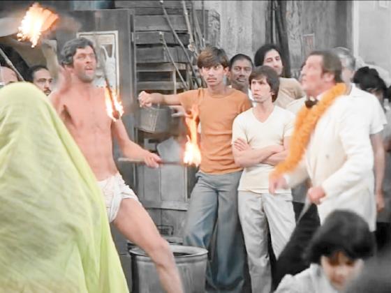 At 0:37:12, Mark Heap juggles 3 torches on the street in India, when Roger Moore, as James Bond, steals one of the torches to use it to fight the bad guy.