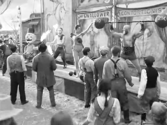 At 02:36, a club juggler and a torch juggler are seen for 20 seconds in the circus backlot as the film opens.