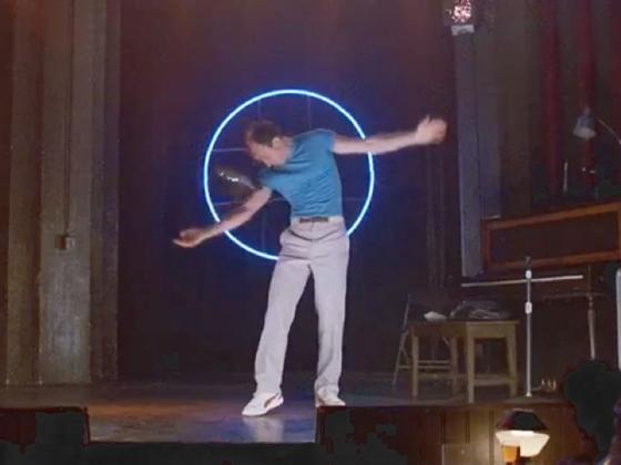 At 58:21, he is seen on stage doing a hat trick and a mime bit for 13 seconds.