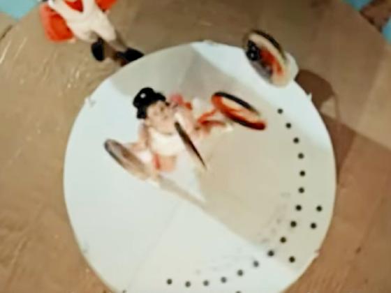 At 1:11:56, Irina Shestua performs part of her circus act, juggling 2,3, and 4 hoops and finishing with a lengthy 4 ball force bounce off of a drum.