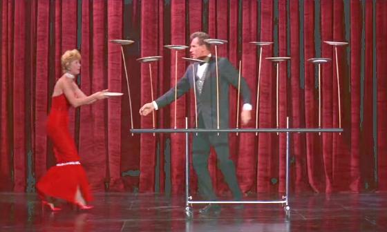 At 55:13, The Carlssons, Carl Carlsson and Ruth Carlsson, are performing their plate spinning routine. As Carl is about to place the tenth and final plate, he trips on the stand holding them, falling down, and knocking all of the plates to the stage floor, where they all shatter to bits, all in 19 seconds.